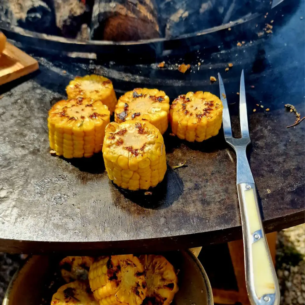Faire griller les maïs en contact direct sur la plancha du brasero TRIO pendant 20 à 30 minutes. Retourner régulièrement les maïs pour qu'ils grillent uniformément sans brûler et les badigeonner de marinade à chaque fois.