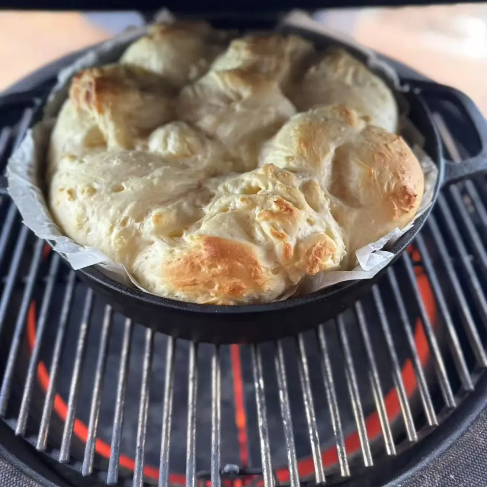 Façonner la pâte : Une fois la pâte levée, dégazez-la légèrement et divisez-la en petites boules de la taille d’une noix. Disposer dans un moule : Disposez les boules de pâte dans un moule allant au Kamado, en les serrant les unes contre les autres. Vous pouvez aussi les disposer en rangées dans un moule à cake ou un autre plat adapté.