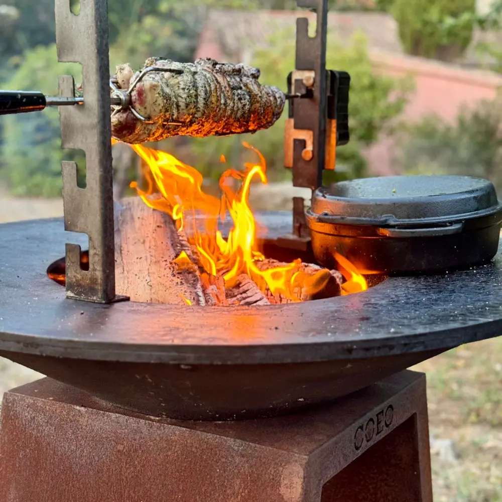 Faites chauffer le brasero. Placez la porchetta sur la broche et fixez-la solidement. Faites cuire pendant environ 1h30 à 2 heures, en tournant régulièrement, jusqu’à ce que la température interne atteigne 70°C et que la peau soit bien dorée et croustillante.