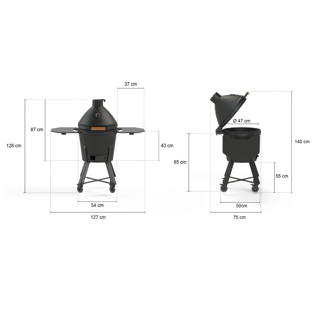 Discover the Kamado QUATRO Large 21" on a trolley with numerous accessories to perfect your pizzas and other dishes. This Japanese ceramic barbecue is designed for those who want to push the boundaries of outdoor cooking. With its generous volume, remarkable thermal stability, and controlled power, it becomes a true artisan pizza oven, capable of reaching high temperatures while ensuring even and crispy cooking.