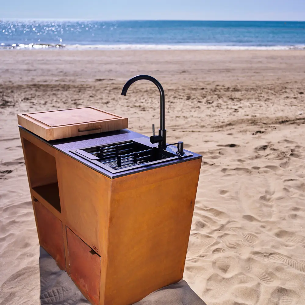 Le Corten s’harmonise idéalement avec le feu et la cuisson au bois. Sa teinte chaude crée une continuité visuelle avec le brasero, transformant l’ensemble en véritable pièce de design extérieur.